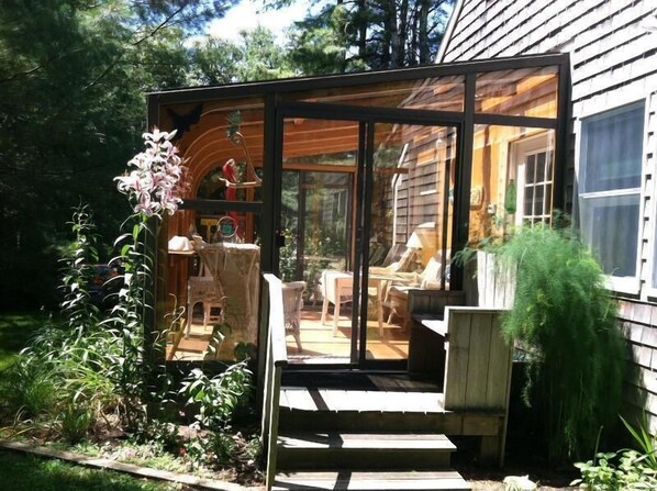 Casa in stile Ranch con aria centrale confortevole, vita facile tutto su un piano! 3 camere da letto, 2 bagni, 6 posti letto con aria centrale, WiFi gratuito e veranda. Splendidi giardini, patio, cortile e una facile passeggiata a Harding's Beach! Tranquilla strada laterale con molta privacy!