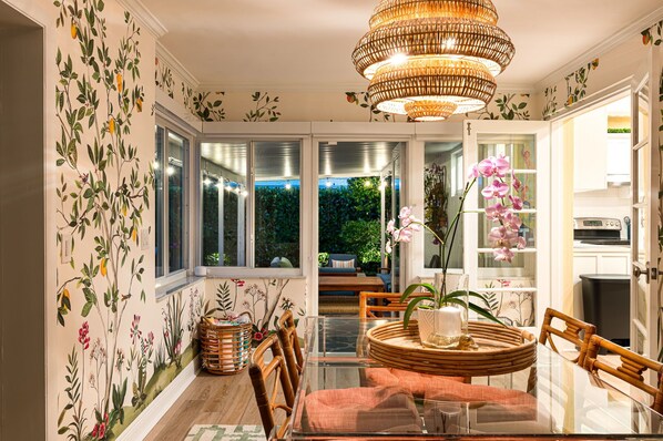 The modern kitchen includes stainless steel appliances, ample counter space, and essentials for meal prep. The adjacent dining area, styled with vibrant wallpaper and rattan lighting, seats six comfortably and opens to the pool deck for easy indoor-outdoor flow.