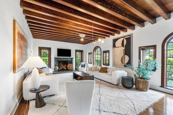 * Living Spaces: Two inviting living rooms, one featuring a cozy indoor fireplace, perfect for unwinding or spending quality time with friends and family.