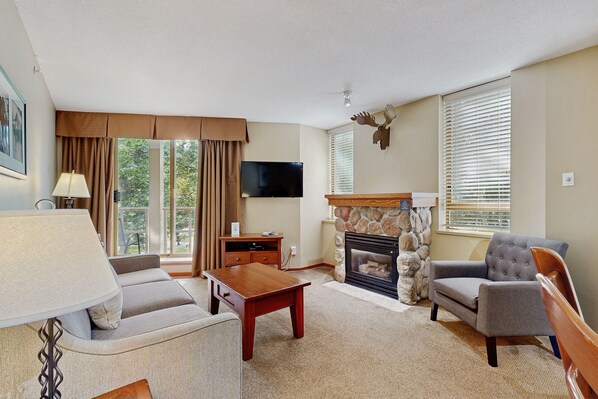 Whether you're visiting with the kids or sneaking off for a long romantic weekend, this condo gives you spectacular mountain views, a warming gas fireplace, a well-equipped kitchen, and a dining table.