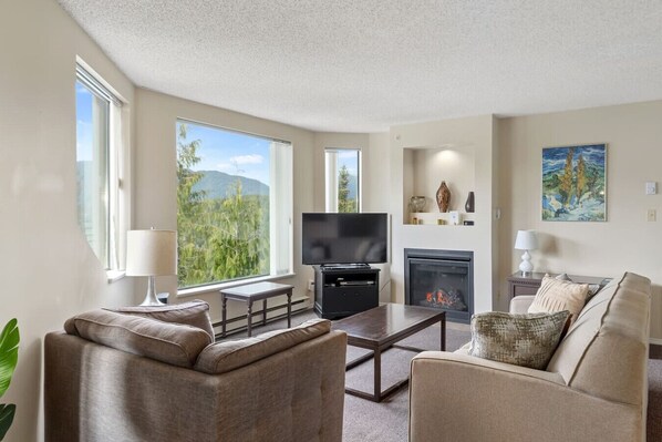 The fully stocked kitchen features modern black stainless steel appliances and has oils and spices provided. The spacious living room has ample seating with a flat screen TV, cozy fireplace and incredible views!