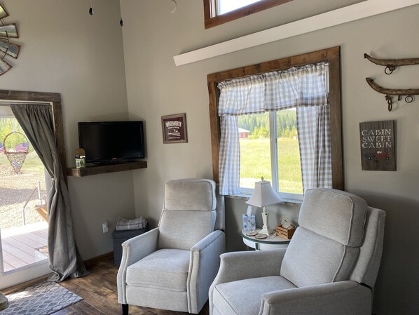 Our property offers a couple of different stay options with two identical tiny cabins (listed separately on this site) and full RV sites. Our tiny cabins offer tiny living with large amenities such as full size refrigerator, stove, microwave, lounge chairs, large shower, Queen bed, and even a loft (w/Queen size air mattress) for younger guests. Each cabin has dishes, utensils, coffee pot, toaster, and electric mixer. Other features include a wood stove for when the snowflakes fall and a ceiling fan with lots of windows to catch the refreshing mountain/meadow breezes. Enjoy your time watching deer graze or fish jump from the porch or relax in a recliner with a book. If a movie sounds good at the end of the day in America’s “Last Best Place” we have wifi, a flat screen, and a Roku for you to stream a movie or countless favorite shows.