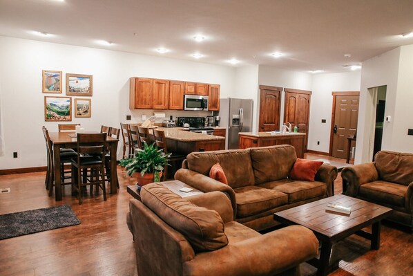 This brand new condo has an open floorplan with one bedroom and one bath. The space is just over 1,000 sq ft and comfortably sleeps 4 adults on one king bed and one queen size pullout. The condo features an open concept living, dining and kitchen area that includes an island, full size kitchen stocked with all cooking essentials, dining table and comfortable living room. Best of all you will have private access to your own balcony with views of Big Mountain and downtown Whitefish.