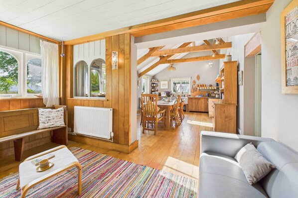 The kitchen / dining area is light and airy. Modern appliances work perfectly with the countryside style and the house retains its charm with beautiful exposed beams and sash windows. The kitchen is fully equipped with a dishwasher, fridge, freezer, kettle, microwave, oven, hob, toaster and washing machine. Entertain friends at the impressively large Elm table which is accompanied with delightful traditional chairs.