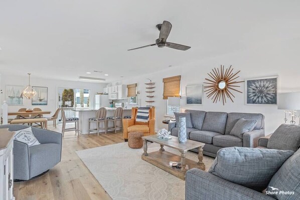 Open floor plan with spacious living room, dining area and island kitchen. The outdoor living space offers open front porch and back deck, plus small yard.