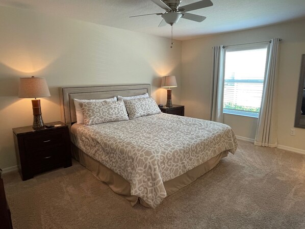 Retreat to the main bedroom featuring a luxurious king-size bed and a 28-inch TV for late-night relaxation. The main bathroom boasts a convenient walk-in shower for your comfort and convenience. Your guests will feel right at home in the cozy guest bedroom, furnished with a queen-size bed.