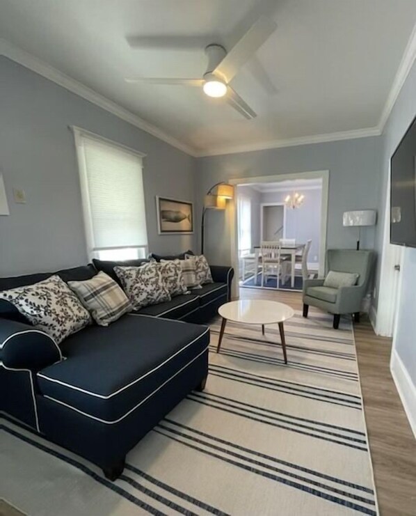 Parking for 2 cars on premises. Linens provided. Fully stocked kitchen, Keurig, WIFI, brand new Roku55 inch LG TV, Washer and Dryer, two beach chairs, small cooler, umbrella.