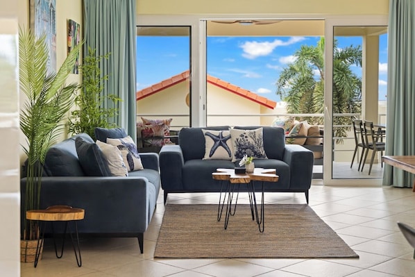 - 2 generously sized bedrooms (King Beds) - 2 full bathrooms + 1 half bath - Air conditioning in bedrooms and living area (please see energy note below) - High-speed Wi-Fi (500 Mbps) - Large resort pool with shaded palapas - Minutes to Parasasa Beach (1 min) & Piscadera Beach (3 min) - Gated community with secure on-site parking - Self check-in with 24/7 local support - Hotel-quality linens and beach towels provided