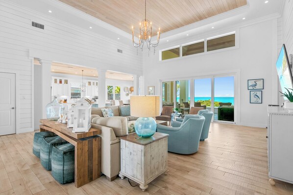 Inside, the villa's open-concept layout is bathed in natural light, featuring a spacious great room with a circular dining table that invites lively conversations and gatherings. The soft color palette of greys, linens, and aquas creates a peaceful ambiance, enhancing your relaxation experience.
