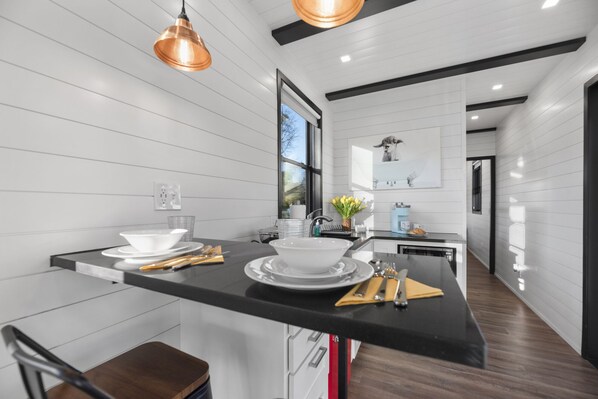 This luxury tiny home is designed with a modern farmhouse chic décor that combines functionality with modern technology comforts. Upon entering a keyless entry French glass double door, you will feel at home surrounded by warm white tones and shiplap walls. Sit back and relax on our plush sofa and listen to some music through the Alexa or watch some TV. Though you may not want to leave your home, we invite you to try to smoke some bbq on the 57” offset smoker or roast smores around the smokeless fire pit while gazing at the starry sky.