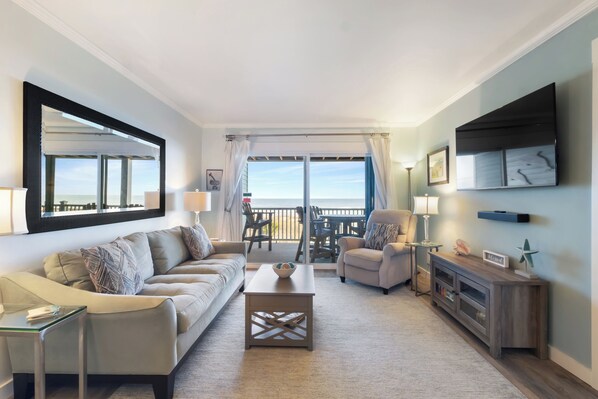• Master Suite – King bed, sliding glass doors to the oceanfront deck, private bath, and flat-screen TV.