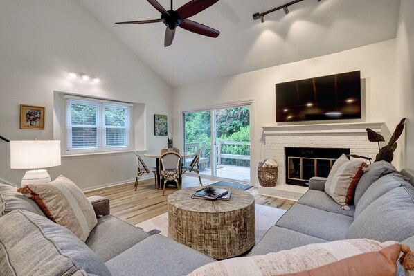The cozy living space has a comfortable sectional couch, bar cabinet and a 65" smart TV. No wood fires are allowed in the townhome.