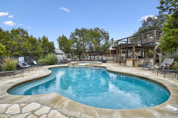 * Wimberley, Tx - Sunset Ridge Escape "VRBO 162562 - 5 BR, 4 bagni, piscina, vasca idromassaggio, sala giochi, cucina all'aperto, 12 acri.