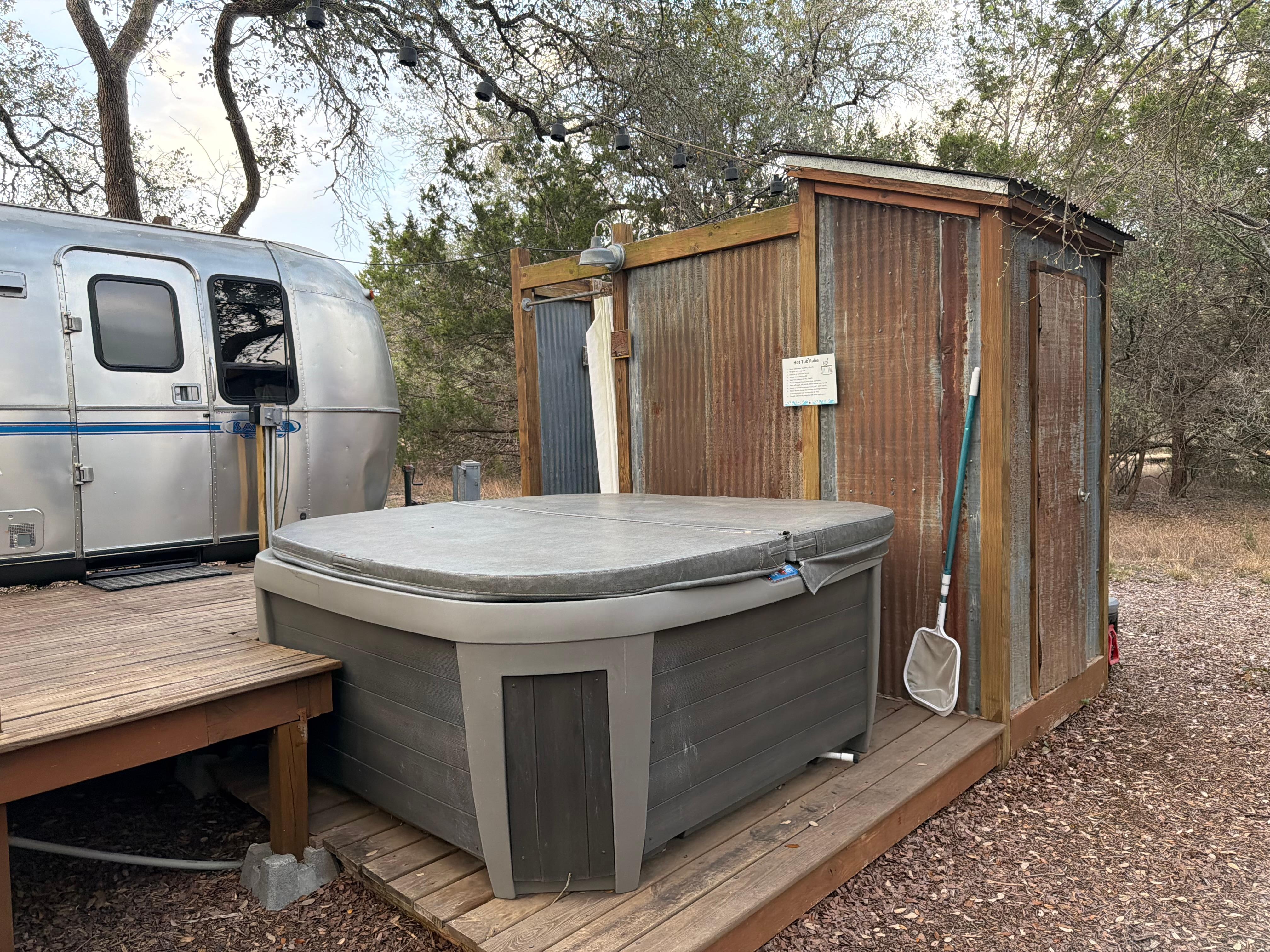Ti capita mai di sognare ad occhi aperti di saltare in un trailer di viaggio e in direzione ovest? Sei innamorato con lo stile vintage di un tempo? Ti piace il campeggio, ma segretamente desiderato di avere un vero letto, wifi e un bagno? Se è così, la Dixie Daisy è per voi! Questo simpatico rimorchio Airstream è stato completamente ristrutturato con un tocco retrò. E 'il luogo perfetto per fuggire per una vacanza rilassante in mezzo alla Wimberley Hill Country natura, ma equipaggiato con le comodità di casa. Grill una cena gustosa con il miele e cenare all'aperto sul grande ponte, fare una passeggiata mattutina lungo il torrente, accendere le luci stringa per un po 'di illuminazione d'atmosfera, fare un tuffo nella vasca idromassaggio, godetevi la vostra doccia mattutina sotto gli alberi nel privato, spaziosa doccia esterna (camera per due!), E terminare la vostra giornata di relax accanto al fuoco con una birra ghiacciata. Questa è la vita!