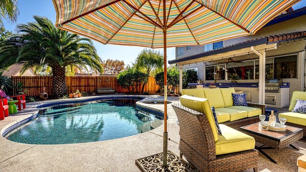 Wine Country Retreat. Large backyard with pool/spa, outdoor kitchen & fireplace
