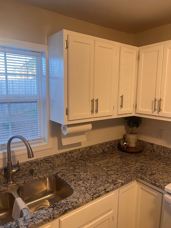 Great property with 1 king bedroom with a TV and 1 queen bedroom with no TV, a good sized bathroom with a shower. In the living room there is a small chair along with a loveseat that is not comfortable if you are over 25, so plan on having coffee or wine comfortably for two on the loveseat! There is also a small desk and plenty of outlets throughout, plus a small TV in the LR. The kitchen is a nice size, has a Keurig machine with Dunkin' Donut coffee pods. The kitchen has a small amount of plates and glassware, silverware. Plenty for 2. Full laundry room- you will need to bring your own detergent if you plan to use the washer & dryer. This property has another rental unit. We could hear them coming and going pretty clearly, but we were lucky they were basically on the same sleep and wake schedules as we were. I would definitely stay here again!