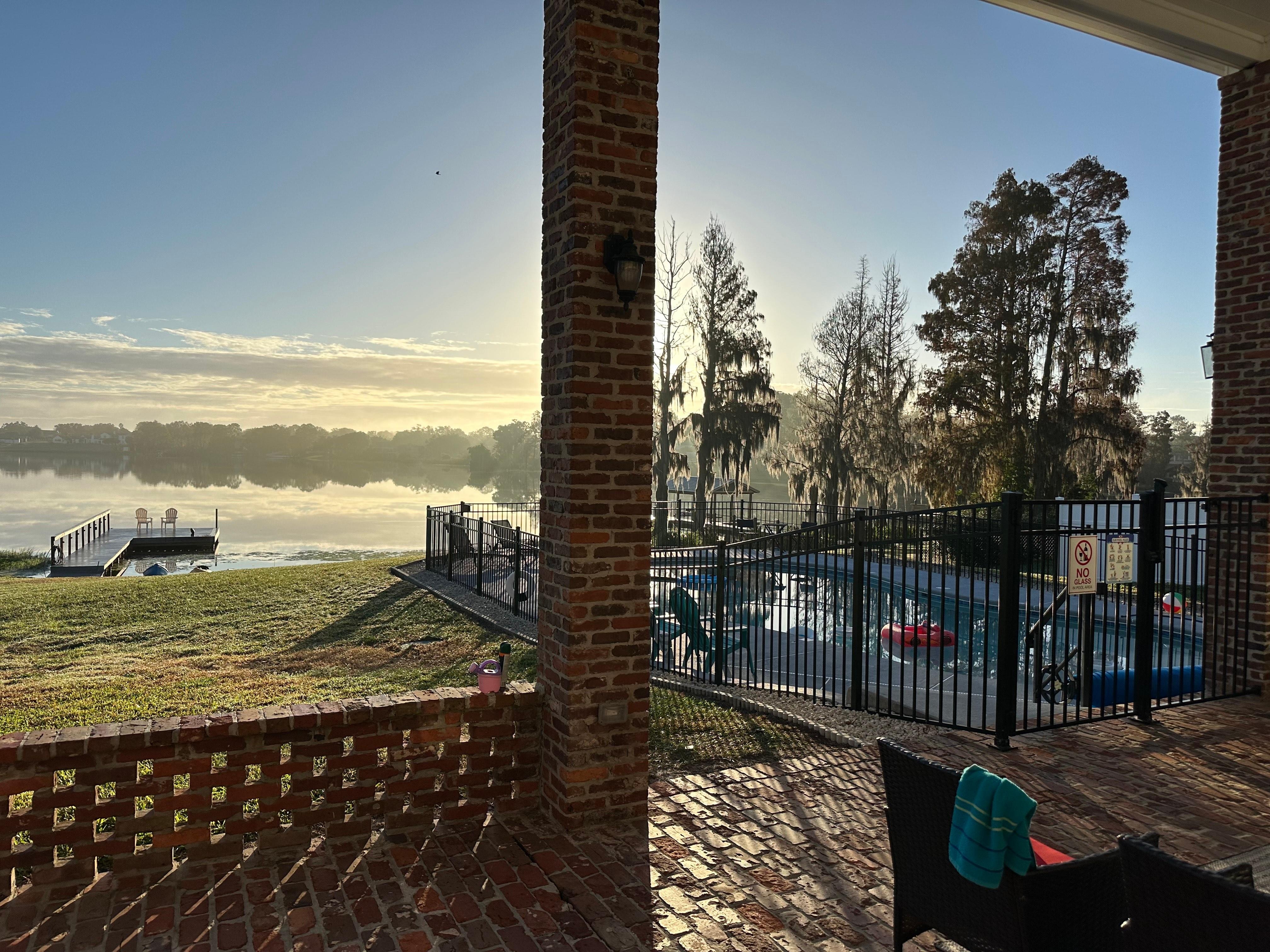 When you enter the main living room, you’ll be greeted by beautiful pool and lake views that instantly remind you why you’re here! You might even stroll right out onto the covered patio to start enjoying the outdoor space right away. But if you stop to check out the living room, you’ll love how comfy and inviting it is. With a plush gray sectional, a wall-mounted flatscreen TV for movie nights, and a cozy fireplace, it’s a great spot to relax with a book or play games with the kids.