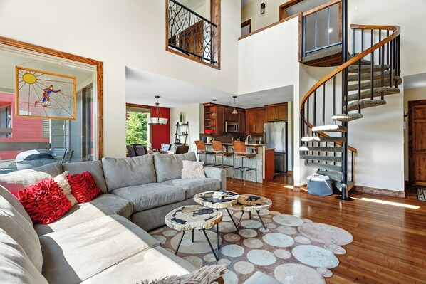 Occupying the top two floors, the condo provides breathtaking, unobstructed views of the majestic Continental Divide and Winter Park. With high lofted ceilings, open floor plans, and expansive picture windows, you'll be immersed in the beauty of the surrounding mountains.