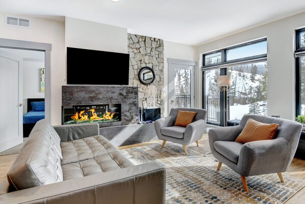 Step outside to discover the shared hot tub, perfect for unwinding after a day of skiing or hiking. The gas grill is ideal for summer barbecues, while the outdoor gas fireplace or firepit creates a cozy atmosphere for evening gatherings.