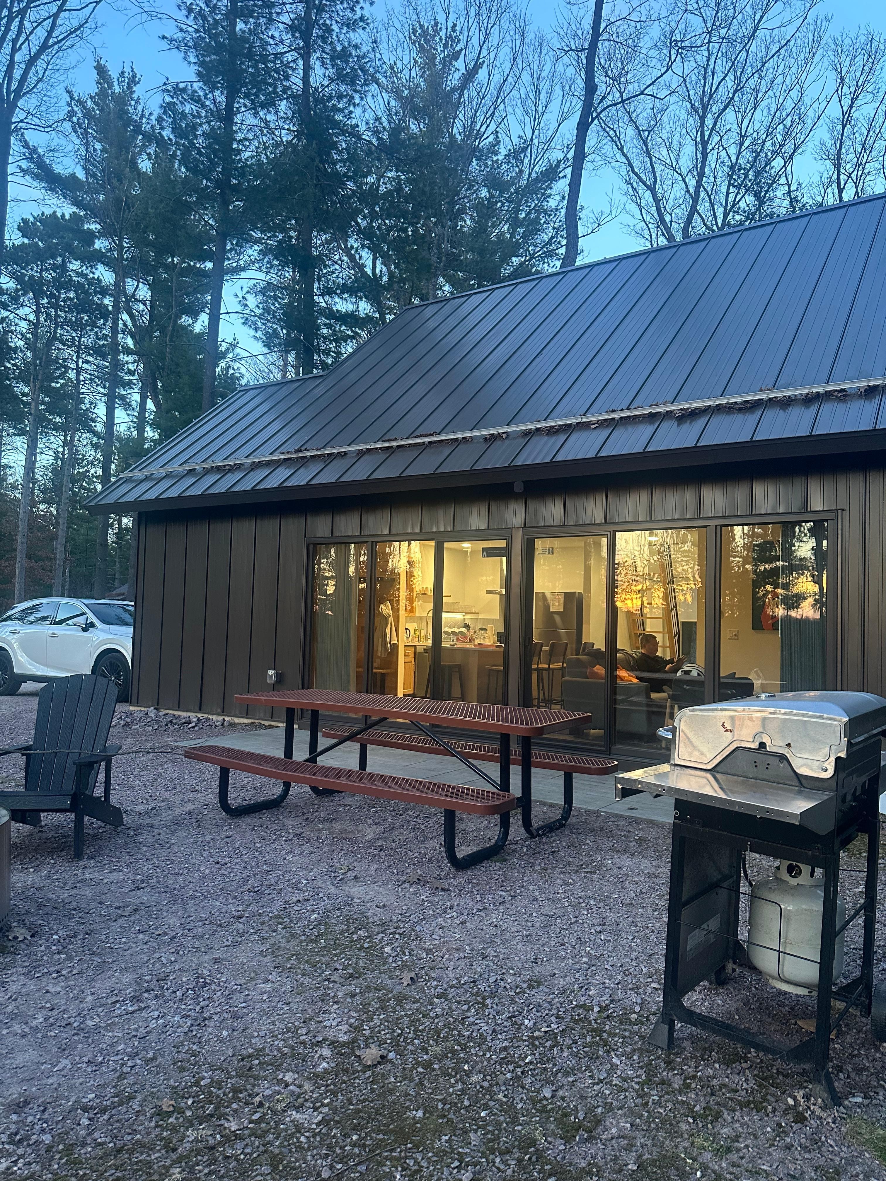 Welcome to Orange Tractor Retreat! Our newly constructed Fox Cabin is one of 5 cabins at OTR, all situated in a large, private cul-de-sac with our namesake Allis Chalmers tractor to welcome you to the Retreat. This cabin features bright, beautiful spaces and functional amenities. Fox is situated to give you the loveliest view of the 40 acres old growth forest and the Wisconsin River. Relax with a cup of coffee or tea when you open the sliding glass doors and walk out to your private patio. There’s Adirondack chair seating, a fire pit, firewood and a gas grill. You’ll love the gorgeous sunrises, and sunsets! (We know we’re in the woods, so we have pest control and mosquito services for the cabin.)