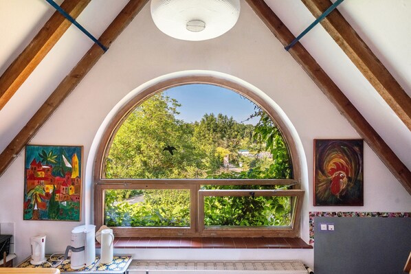 La casa si trova in un giardino naturale di 6.500 mq con piscina (utilizzabile con un supplemento per la pulizia), doccia esterna, barbecue, focolare, forno in argilla, stagni e numerosi angoli relax. Un punto forte è la "Wirbelhaus", una struttura in legno autoportante dove potete rilassarvi e ricaricare le energie. L’atelier per le vacanze dispone di una propria area salotto sotto un noce.