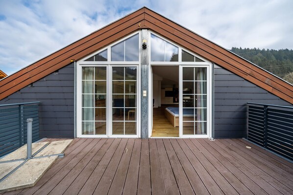 Offriamo ai nostri ospiti due grandi terrazze con barbecue, ping-pong, parco giochi, prato per prendere il sole con piccola piscina, una porta da calcio che può essere posizionata sul prato.
