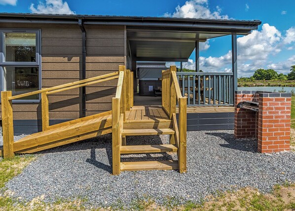Spacious, modern and luxurious lodge with one master double with en suite shower and two twin (one twin can be made into a double by arrangement). Bath with overhead shower. open-plan living with spacious lounge/kitchen/dining area with doors leading out to decking area with outdoor hot tub and barbecue. Lake views. Adjacent parking.