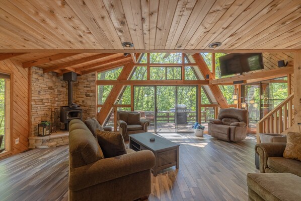 Charming, secluded chalet located by Innsbrook’s largest lake, Lake Alpine! This unique property blurs the lines between a stylish, contemporary home design and your childhood treehouse floating above the forest floor. An oversized wall of windows creates a comforting atmosphere, bringing the outdoors indoors and providing breathtaking views of the unique wildlife that resides within the gates of Innsbrook Resort. Cedar panels line the walls and vaulted ceilings, while recently renovated hardwood floors add to the warmth of the rustic interior. Complete with two bedrooms, two full baths, a wood-burning fireplace, fully equipped kitchen, luxury furniture, and dining area, this chalet offers everything for your perfect getaway!