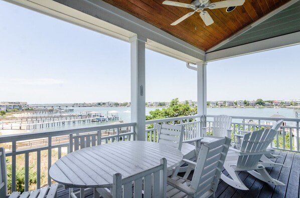 Upstairs, the top level stuns with floor-to-ceiling windows that flood the open-concept living, dining, and kitchen areas with natural light and uninterrupted sound views. Whether you're lounging in the living room, preparing meals in the spacious kitchen, or gathering around the dining table, every moment is framed by the beauty of the water. Step onto the covered porch to enjoy a sunset dinner with loved ones. This level also includes two additional bedrooms and two full bathrooms, ensuring ample accommodations for your group.