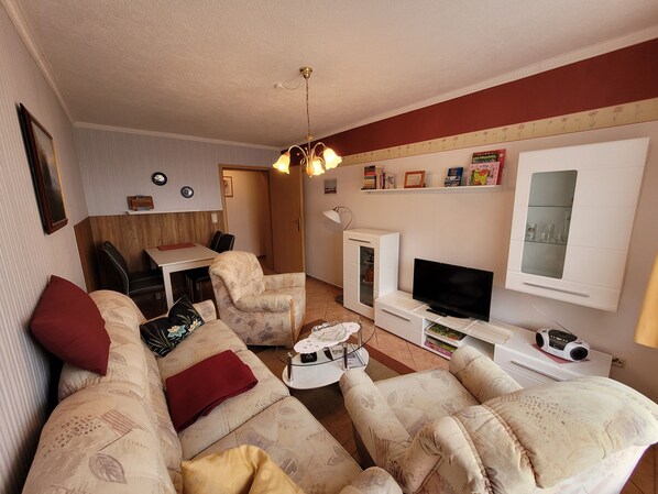 L'appartamento completamente arredato con soggiorno, due camere da letto con letto matrimoniale e due lettini, angolo cottura, doccia, bagno, sala e grande terrazza a circa 15 metri accanto all'appartamento sarebbe pronto per te. I servizi includono radio, TV digitale, lenzuola e asciugamani una volta. Nell'angolo cottura sono presenti microonde, macchina per il caffè e tostapane, uova e bollitore e fornello a 2 piastre, frigorifero e stoviglie disponibili. Un letto supplementare è possibile nel soggiorno previo accordo sul divano allungabile. Ogni appartamento ha un parcheggio gratuito per la tua auto. Nei nostri locali c'è un parco giochi per bambini, una zona barbecue, in estate sono disponibili una sala giochi per bambini piccoli e una sala club per ping-pong e biliardo.