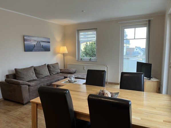 "Seemöwe Lilli", apt. di 2 locali 60 m2, piano rialzato. In parte restaurato nel 2024, arredamento elegante e accogliente: soggiorno/sala da pranzo con 1 divano letto doppio e TV (via cavo) (schermo piatto), radio. Uscita sul balcone. 1 camera con 1 letto doppio. Cucina (lavastoviglie, 4 piastre cottura in vetroceramica, tostapane, bollitore elettrico, forno a microonde, macchina da caffè elettrica). Doccia/WC. Balcone. Mobili da balcone. A disposizione: seggiolone, lettino per bimbi. Parcheggio (1 Auto). Prego notare: appartamento per non fumatori. Allarme antifumo.