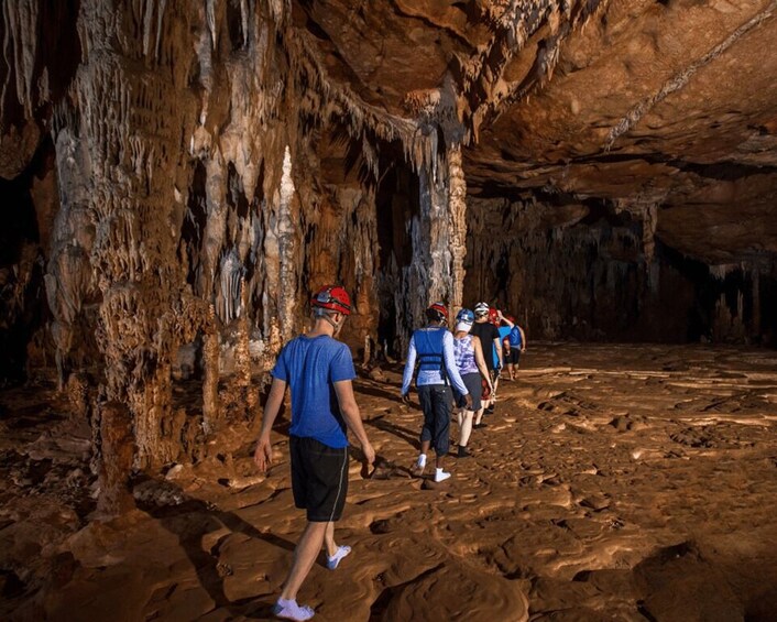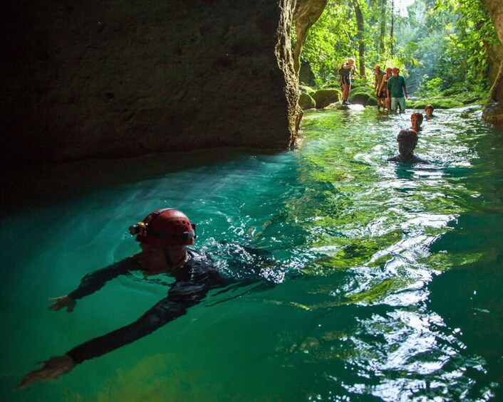 Al parcheggio, sarai equipaggiato con caschi, fari e giubbotti di salvataggio prima di intraprendere una passeggiata di 45 minuti in piano verso l'ingresso della grotta. Durante questa passeggiata, attraverserai il fiume tre volte. Se non sai nuotare, la guida turistica sarà lieta di assisterti in qualsiasi modo.