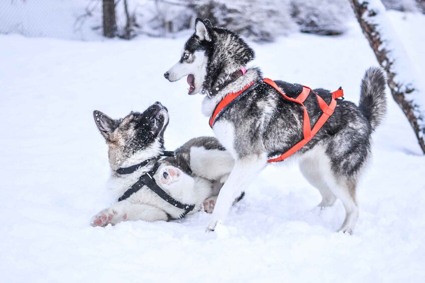 Scivola sulla neve artica in compagnia degli husky. Scopri l'addestramento degli husky. Riscaldati davanti a un fuoco aperto. Sorseggia bevande calde in una tradizionale capanna finlandese.