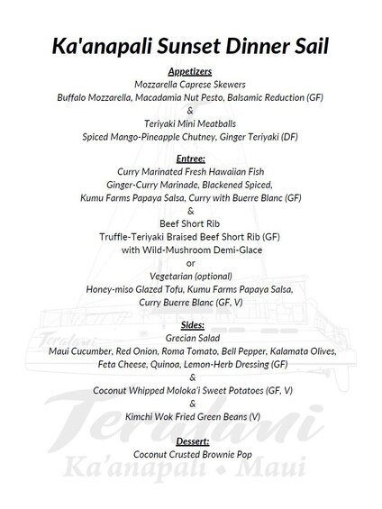 Concediti una cena gourmet in acqua e una piacevole navigazione al tramonto lungo la famosa costa di West Maui con Teralani Sailing. Questo tour di 2,5 ore ti porta a bordo di un lussuoso catamarano dove potrai gustare un pasto di quattro portate ispirato da uno chef, con ingredienti freschi dell'isola e sapori locali. Sorseggia una birra, un vino, uno champagne, un mai tai o un cocktail tropicale a scelta dal nostro open bar e goditi la musica dell'isola mentre navighi lungo la costa panoramica di Kaanapali Beach. Osserva le balene (stagionalmente), i delfini e le tartarughe mentre ti godi il tramonto all'orizzonte. Regalati una serata indimenticabile con la Ka'anapali Sunset Dinner Sail di Teralani.