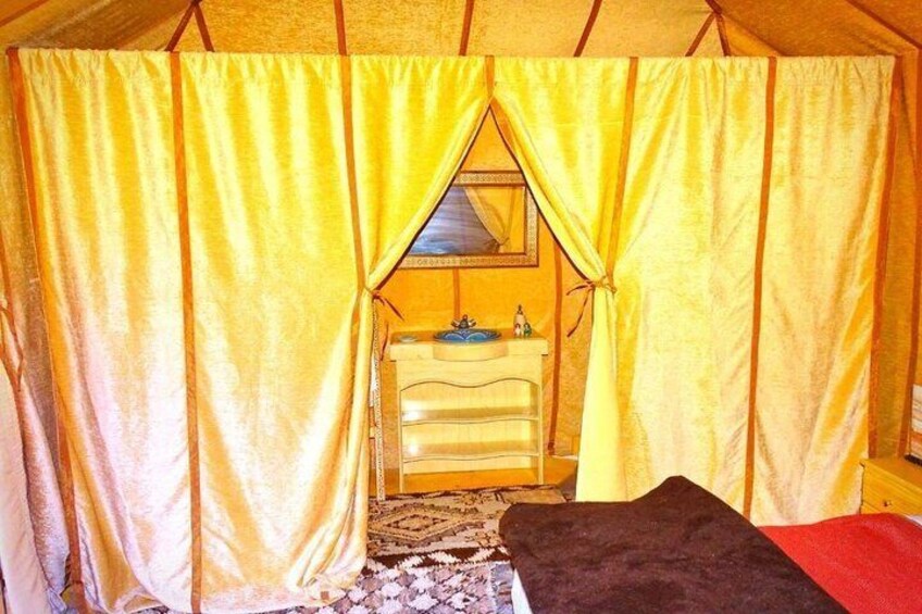 Campeggio di lusso nel deserto di Merzouga: Tenda privata con bagno privato doccia e servizi igienici.