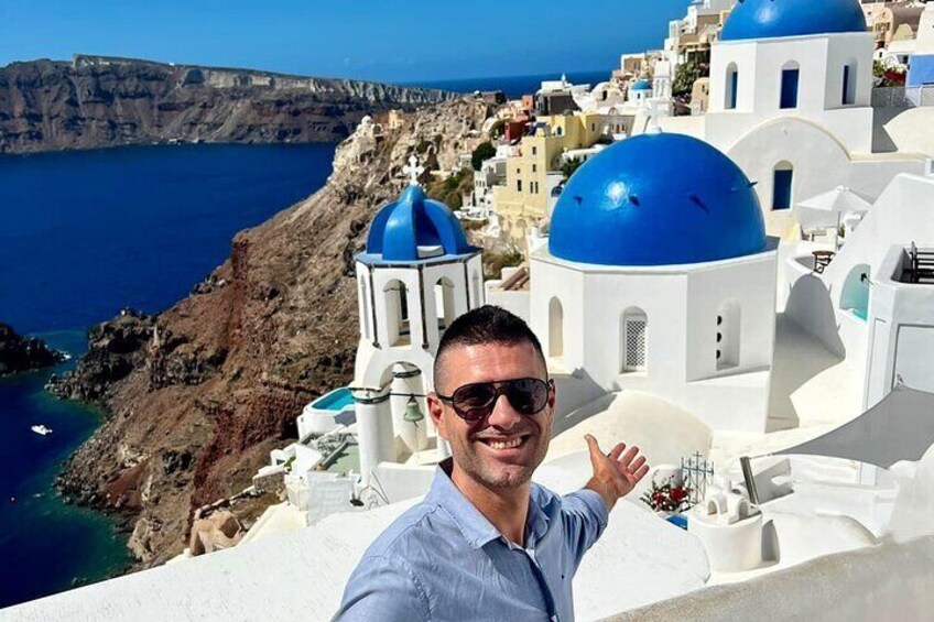 Visita Oia e le Tre Cupole Blu, sosta fotografica alle Tre Campane di Fira — il tutto in una panoramica visita guidata di 3 ore.